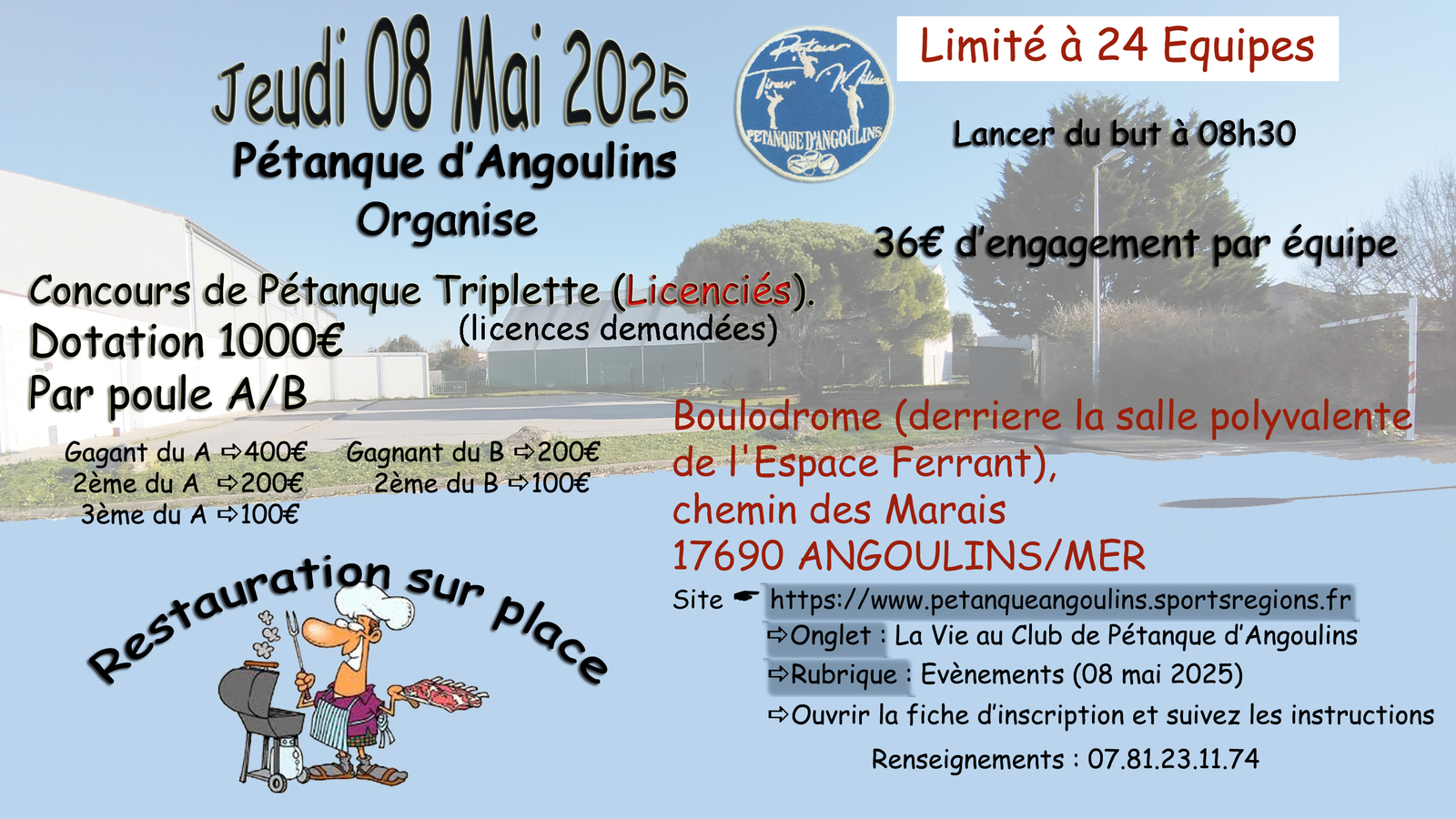 Nous souhaitons exprimer notre profonde reconnaissance pour l'organisation remarquable du concours de pétanque du 8 mai 2025. Grâce à votre engagement et à votre passion, cet événement fut une véritable réussite, rassemblant joueurs et spectateurs dans une ambiance conviviale et compétitive.